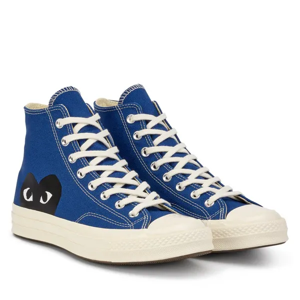 The Blue Converse x Comme des Garçons PLAY Chuck 70 High Top reinvents the classic Converse silhouette with Rei Kawakubo’s playful design touch. Crafted from premium canvas, this sneaker features the iconic red heart-with-eyes logo by Filip Pagowski peeking along the sidewall, adding a bold statement to the vintage-inspired Chuck 70 design.