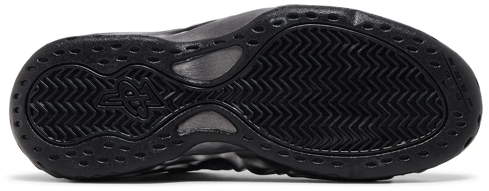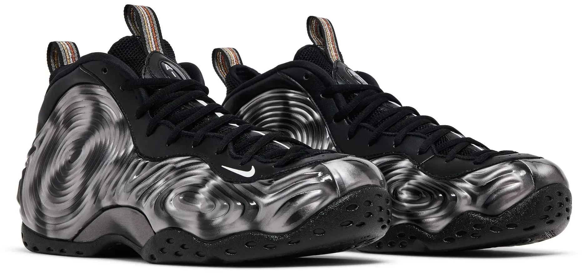 Upper: A striking marbled black-and-gray ripple pattern envelops the Foamposite shell — crafted using a specialized mold that plays with texture similar to Japanese zen garden ripples